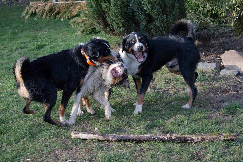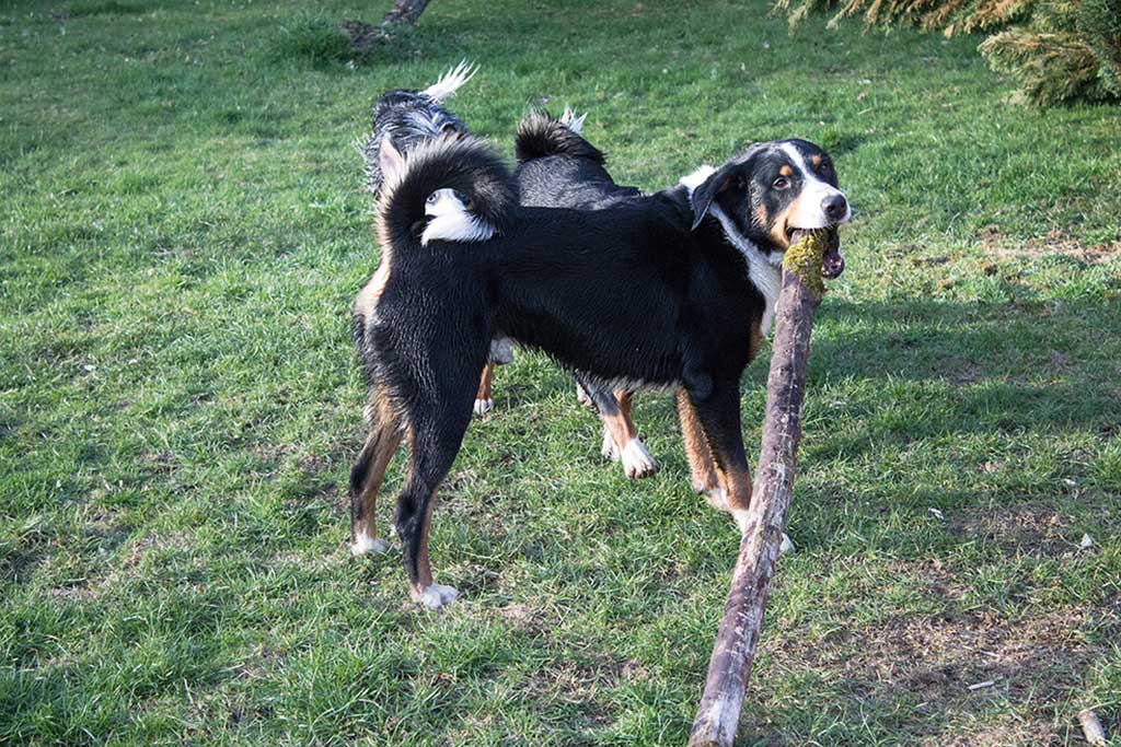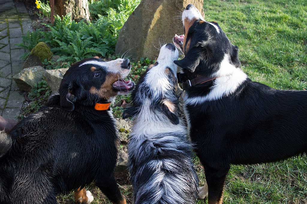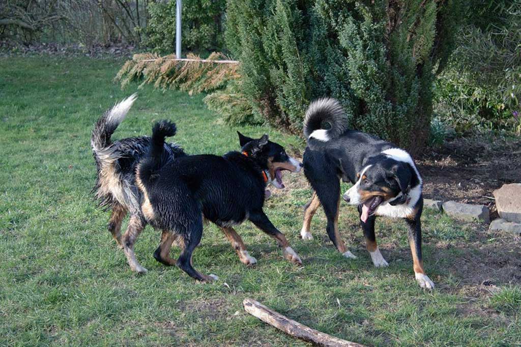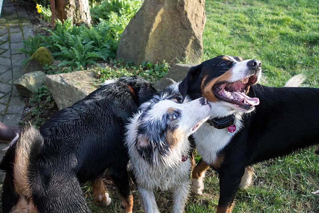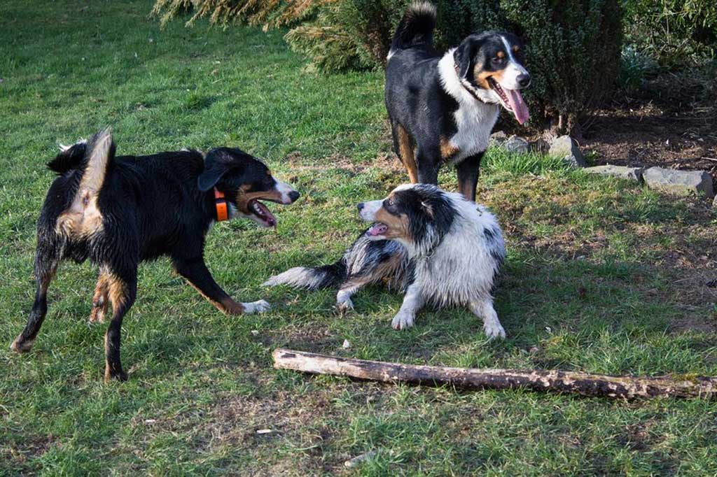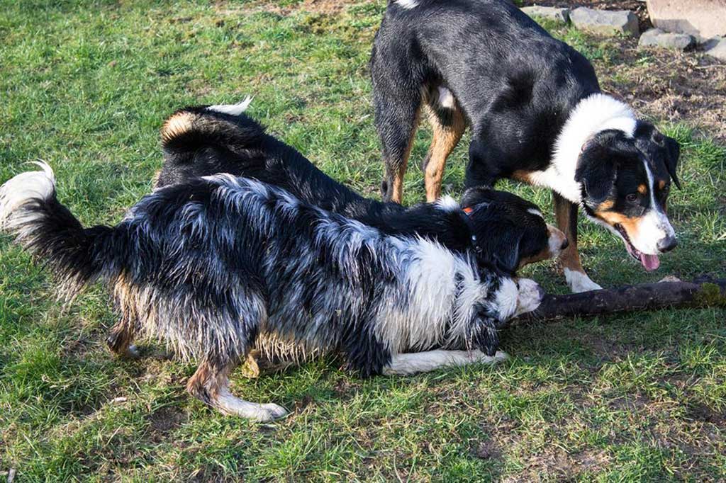 Nix wie raus aus der Bude! Zum (eigentlich) geplanten Spaziergang kam es allerdings nicht, da wir, kaum aus dem Haus, von Bruno abgeholt wurden. Bruno ist einer der beiden Appenzeller-Rüden unserer Nachbarn und immer für ein gemeinsames Spiel gut.