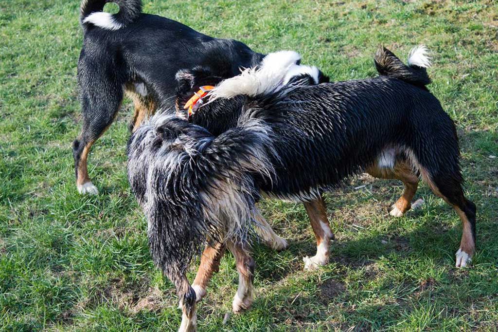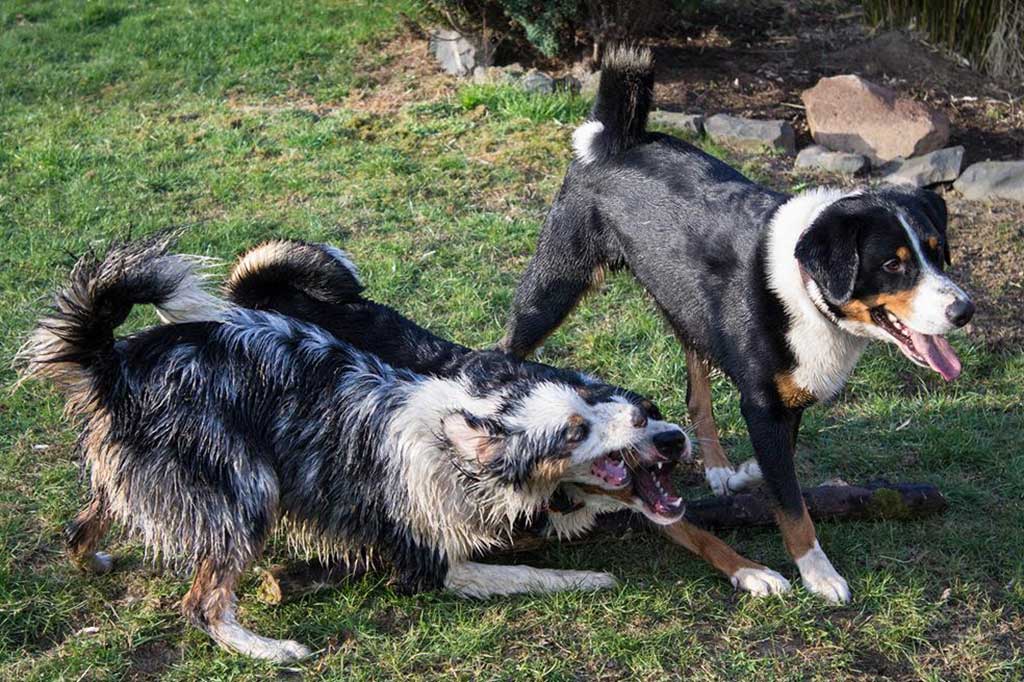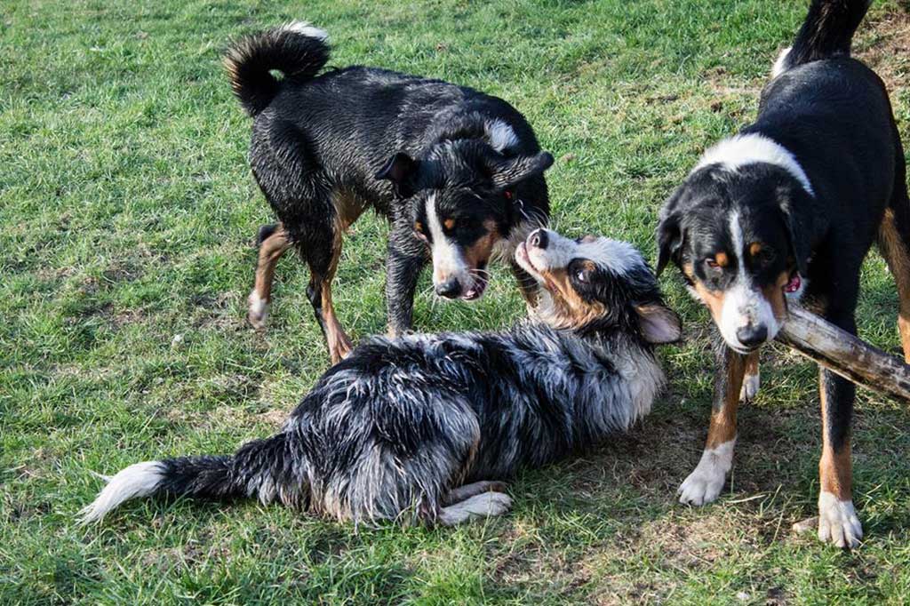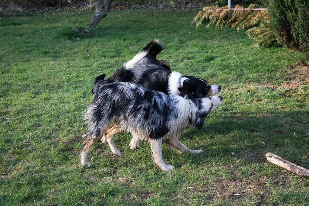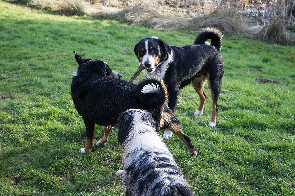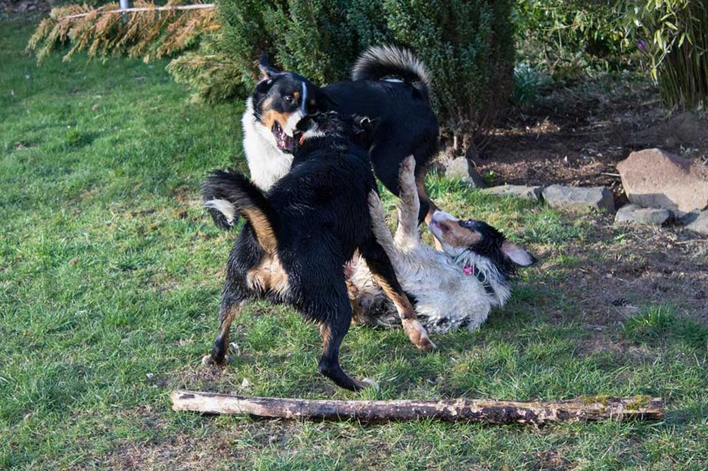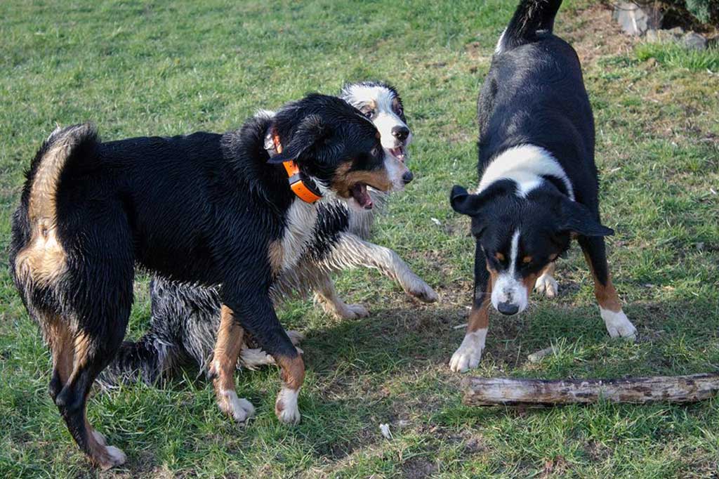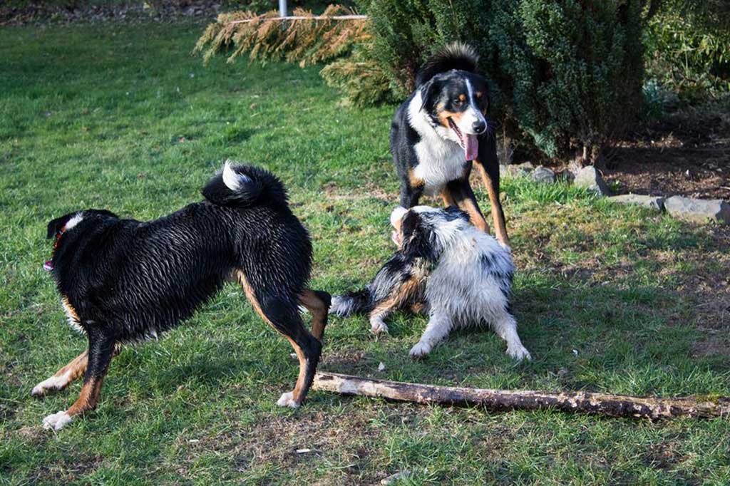 Nix wie raus aus der Bude! Zum (eigentlich) geplanten Spaziergang kam es allerdings nicht, da wir, kaum aus dem Haus, von Bruno abgeholt wurden. Bruno ist einer der beiden Appenzeller-Rüden unserer Nachbarn und immer für ein gemeinsames Spiel gut.